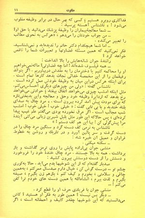 - … اما یک چیز هست، این را بدانید، اگر همهٔ اینها دروغ و بازی باشد، اگر شوخی باشد و دکتر حاتم دستمان انداخته باشد، و یا این همه خواب و رؤیائی بیش نباشد و اگر من بتوانم بار دیگر مثل دیروز و پریروز مالک زندگی و ملکوت و خانه و ادارهٔ خودم باشم، نه یک هفته بلکه یک عمر، و از این کابوس نجات پیدا کنم همین فردا خودم را خواهم کشت؛ خواهم کشت که مبادا روزی لش سنگینم از ترس مرگ، زودتر از موعد به زمین بیفتد و یا روی دست آشنایانم بماند. بله، اگر عمر دوبارهای به من ببخشند دیگر احمق نخواهم بود.