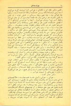 - هر کس به نحوی مطالب را تعبیر میکند. شما از پیچیدگی حرف میزنید اما من اصلاً به فکر تعبیر و تفسیر نمیافتم. در این مورد توضیح بدهم: اگر تا به حال به مطب دکتر حاتم رفته بودید به آگهی او توجه میکردید که میگوید فقط تا ساعت یک بعد از نیمهشب آمادهٔ پذیرائی است. از آن گذشته خود او شفاهاً به همه تذکر میدهد که خواب و استراحت برای هر انسانی لازم است و نباید بیهوده مزاحم او بشوند. معهذا بارها مریضهای بیشماری را که بین ساعت یک و صبح به در خانهاش رفتهاند پذیرفته و معالجه کرده است.