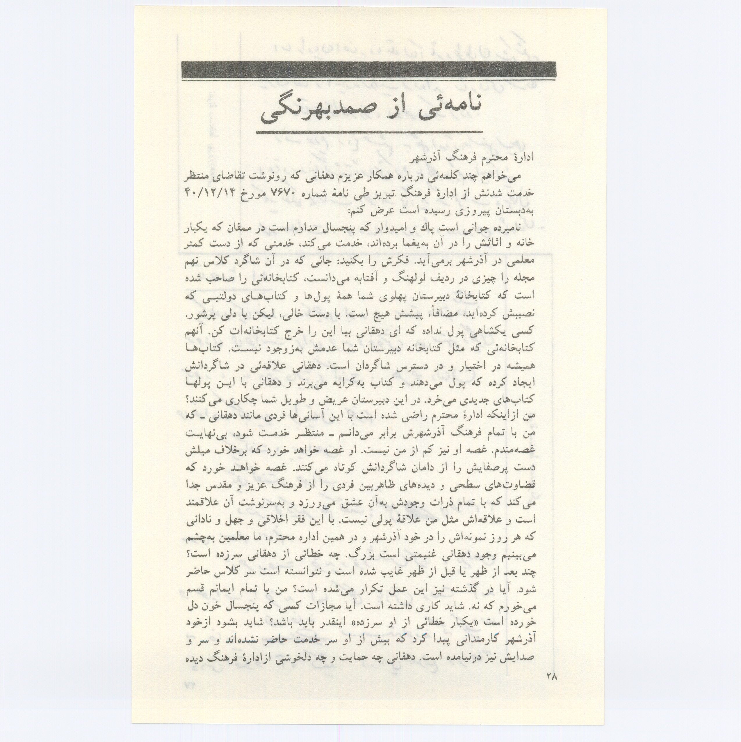 | ۳۰ آوریل ۲۰۱۰، ساعت ۰۵:۴۹ | 6-027.jpg (پرونده) | ۲٫۳۲ مگابایت | کتاب جمعه سال اول شماره ۶ صفحه ۲۷ | ۱ | |