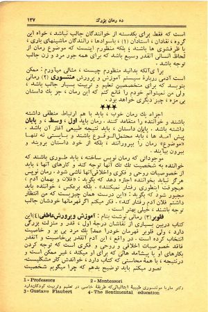 فلوبر[۴] رمانی نوشت بهنام: آموزش و پروش عاطفی[۵] این کتاب در بین بسیاری از نقاشان درجهٔ اول، قدر و منزلت بزرگی دارد، ولی فلوبر قهرمان خود را عمداً یک مرد بیبو و خاصیت انتخاب کرده است. در واقع، این آدم آنقدر بیخاصیت و آنقدر فاقد خصوصیات اخلاقی و روحی و فکری است که توجه کردن بهکارهای او یا پیشآمدهائی که برای او میکند، غیرممکن است و درنتیجه، با همهٔ محاسنی که کتاب دارد، خواندش کار مشکلیست.