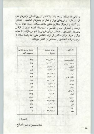 در حالی که ممالک توسعهیافته با کاهش نیروی انسانی ارتشهای خود کوشش دارند از نیروهای جوان و فعال در بخشهای تولیدی و خدماتی بهره گیرند و از میزان بیکاری مخفی بکاهند ممالک وابسته جهان سوم با توسعه و گسترش نیروی نظامی و استخدام افراد جوان از طرفی بخشهای اقتصادی و خدماتی نوپای خویش را نابود میسازند و از طرف دیگر با صرف مبالغ هنگفتی از تولید ناخالص ملی (یک پایه) امکان هر نوع پیشرفت اقتصادی و اجتماعی را تقلیل میدهند.