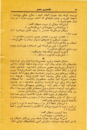 «-های کرهخرهای نفهم، که دم گوری هستین؟ مشغول چه کارین؟ ها؟ وقتی دنیا را سپردهام دست شما همهچی یادتون رفته؟ تو کدوم سوراخی هستین؟ فایده شماها چیه؟ تا من سرمو زمین میذارم همهچی تموم میشه؟ این راهی را که شما گرفتهاین میدونین کدوم راهه؟ راه انحرافی و دور از اصوله، دور از اصول شیطانی که به هیچ جا نمیرسه، واسهتون بگم که اگه چند مدتی به همین منوال بگذره، حسابمون پاک پاکه، میفهمین؟ میفهمین یا نه؟ کو اون دیوونگیهای قدیم؟ کو اون جنگها و حماسهها؟ کو اون عیشهای قدیمی؟ اون روزگارانی که زندگی جوش و خروشی داشت؟ ها؟ با شما هستم کو؟ کو؟»