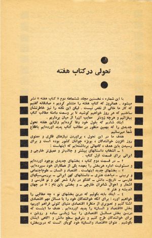 امید است تحول جدیدی را که در کار «کتاب هفته» پدید آوردهایم و از همین شماره آغاز شده است، بپسندید و ما را مورد عنایات بیشتر خویش قرار دهید.