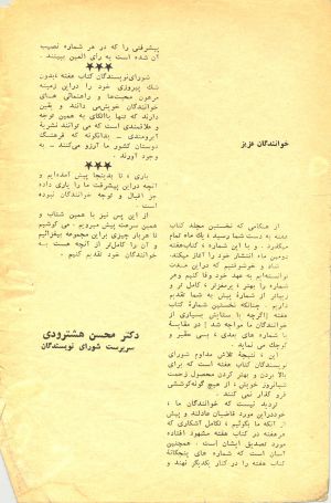شورای نویسندگان کتاب هفته، بدون شک پیروزی خود را در این زمینه مرهون محبتها و راهنمائیهای خوانندگان خویش میدانند و یقین دارند که تنها با اتکای به همین توجه و علاقمندی است که میتوانند نشریهٔ آبرومندی – بدانگونه که فرهنگدوستان کشور ما آرزو میکنند – به وجود آورند.