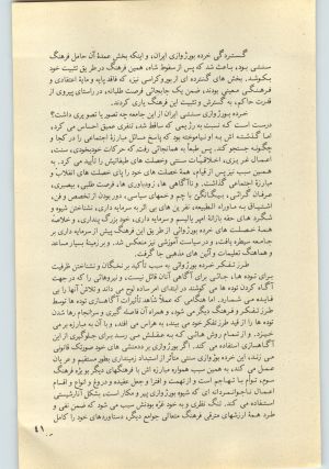 جامعهٔ ایران از نظر رشد ذهنی عمدتاً با فرهنگ سرمایه‌داری منطبق نبوده است. رژیم گذشته با اعمال سیاست‌های گوناگون مانع می‌شد که مردم به آگاهی‌های مناسب دست یابند. حتی برخورداری از امکانات معمول جامعهٔ سرمایه‌داری نیز برای مردم میسر نبود. تبلیغ اندیشه‌های ناسالم و ایجاد اغتشاش فرهنگی، بویژه تأکید بر آن بخش از مسائل و پدیده‌های منحط و فاسدکنندهٔ سرمایه‌داری، یا مردم جامعهٔ ما را خود بخود از گرایشهای سالم و مترقی بازداشت، و یا آنها را به پاسداری از ارزشهای سنتی خودشان برمی‌انگیخت. این تعارض بویژه در زمینهٔ گستردهٔ بیسوادی در جامعه، شدت یافت.
