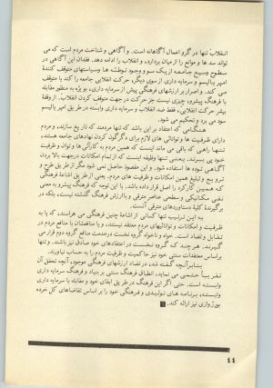 تا پیش از قیام بهمن جنبش مردم ما عمدتأ خودانگیخته و خودبخودی بود. اما از آن زمان ببعد، با تأثیری که عوامل بازدارنده بر جامعه گذاشته‌اند، ادامهٔ انقلاب تنها در گرو اعمال آگاهانه است. و آگاهی و شناخت مردم است که می‌تواند سدها و موانع را از میان بردارد، و انقلاب را ادامه دهد. فقدان این آگاهی در سطوح وسیع جامعه از یک سو و وجود توطئه‌ها و سیاستهای متوقف‌کنندهٔ امپریالیسم و سرمایه‌داری از سوی دیگر، حرکت انقلابی جامعه را کند یا متوقف می‌کند. و اصرار بر ارزشهای فرهنگی پیش از سرمایه‌داری، بویژه به منظور مقابله با فرهنگ پیشرو، چیزی نیست جز حرکت در جهت متوقف کردن انقلاب. از وقفهٔ بیشر حرکت انقلابی، فقط ضد انقلاب و سرمایه‌داری وابسته در طریق امپریالیسم سود می‌برد و تحکیم می‌شود.