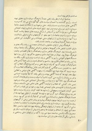 در جامعهٔ ما، که یکی از مراحل تکامل تاریخی‌اش را می‌گذراند، صورتبندی اجتماعی – اقتصادی معینی وجود دارد، که همان سرمایه‌داری وابسته است. و بنا بر آنچه گذشت فرهنگ خاصی نیز باید داشته باشد. وجه عمومی این فرهنگ، چنانکه می‌دانیم، پیروی از خط فرهنگ سرمایه‌داری است. اما از آنجا که در دوران حکومت شاه، شیوهٔ تولید و صورتبندی اقتصادی ایران، تنها به ارادهٔ امپریالیسم و به صورت مکانیکی تغییر یافت، صورتبندی اقتصادی جامعه چیزی شد در رابطهٔ ارگانیک با امپریالیسم، و فرهنگی که در جامعه برقرار بود (یعنی فرهنگ متعلق به شیوهٔ تولید زمینداری)‌، به صورت خود باقی ماند. و آن نفی دیالکتیکی که از قانونمندی تکامل جامعه نتیجه می‌شود، تحقق نیافت. یعنی چون این تحول بنیادی نبود، و از دورن خود جامعه زائیده نشده، و رشد نکرده بود، و در اثر مبارزات طبقاتی به شکل معین و سالم خود بوجود نیامده بود، شکل مناسبات جامعه، سرمایه‌داری وابسته شد، و فرهنگ پیش از سرمایه‌داری در قسمت اعظم جامعه بجای خود باقی ماند. ضمناً پیش از این گفته شد که با تغییر سالم و هماهنگ صورتبندی اجتماعی – اقتصادی یک دوران نیز، عناصر فرهنگی گذشته به یکباره از میان نمی‌روند، بلکه تا هنگامی که ارزشهای جدید بتوانند سیطرهٔ خود را بر ارزشهای قدیم اعمال کنند، باقی می‌مانند. به همین سبب در دوران سرمایه‌داری وابستهٔ شاه،‌ این مسأله با تأثیر مضاعفی تشدید یافت. در رژیم گذشته همین فرهنگ پیش از سرمایه‌داری وسیلهٔ نیرومندی شد برای تحکیم پایه‌های دیکتاتوری. خصلت‌های سنتی و تصورات و باورهای گذشتهٔ مردم که با حاکمیت فردی انطباق داشت، و تجربه‌ای طولانی از رابطه با ستمشاهی را منتقل می‌کرد، سبب شد که دیکتاتوری عوامل بقای خود را در فرهنگ سنتی نیز بجوید. وبا اعمال سیاست‌هائی که بعداً به آنها خواهیم پرداخت،‌ مانع زوال این ارزشها شد.