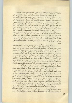 تردیدی نیست که باید با فرهنگ سرمایه‌داری، و اساساً با نظام سرمایه‌داری وابسته و غیروابسته مبارزه کرد. تردیدی نیست. که باید با فرهنگ استعماری جنگید. و درجهت ترقی و تکامل جامعه به استقلال فرهنگی دست یافت. اما چگونه، و با چه ابزاری؟ و با چه سیاست و برنامه‌ای؟ آیا مقابله و برخورد با فرهنگ سرمایه‌داری، با بازگشت به گذشته میسر است؟ گفته شد که فرهنگ یک مقولهٔ ذهنی و انتزاعی نیست. و تنها در رابطه با نهادهای متحول هر دوران شکل خاصی می‌یابد، و تغییر می‌پذیرد. از این رو برخورد با یک فرهنگ به منظور تغییر آن، بناگزیر باید به یاری عواملی صورت گیرد که امکان تغییر بنیادهای مربوط به آن را داشته باشد. همچنان که با ارزشهای مادی فرهنگ بیش از سرمایه‌داری نمی‌توان به مقابله با ارزشهای مادی فرهنگ سرمایه‌داری رفت، با ارزشهای معنوی آن دوران نیز نمی‌توان به مقابله با انحرافات و فساد فرهنگ معنوی سرمایه‌داری وابسته پرداخت. در اینجا ابزارهائی دیگر و ارزشهائی دیگر لازم است.