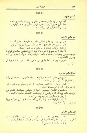 امشب برای ما برنامههای هنری ترتیب داده بودند. تماشای خوبی کردیم. هم سازش عالی بود، هم آوازش. راستی که خیلی خوش گذشت.