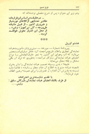 «- چون مراسم استقبال آقایونو روی اسکله فراهم کردهایم، اجازه بفرمائین اول بریم اونجا که تشریفات و مراسم انجام بشه؛ اونوخت هیأت اقتصادی تشیف میبرن هتل، استراحت میکنن.
