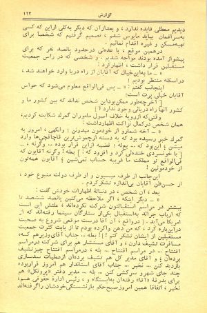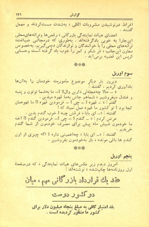ابتدا خیال میکردیم نقشه چیدهاند که با شبنشینیها و ضیافتهای پیدرپی و مشروبهای سنگین، خستهمان کنند و پشت میز مذاکرات سرمان کلاه بگذارند. ولی اکنون از هر حیث به آن مقام محترم اطمینان قاطع میدهم که مطلقاً چنین خبرهائی نیست. بلکه میهماننوازی از سجایای اخلاقی این ملت شریف است.